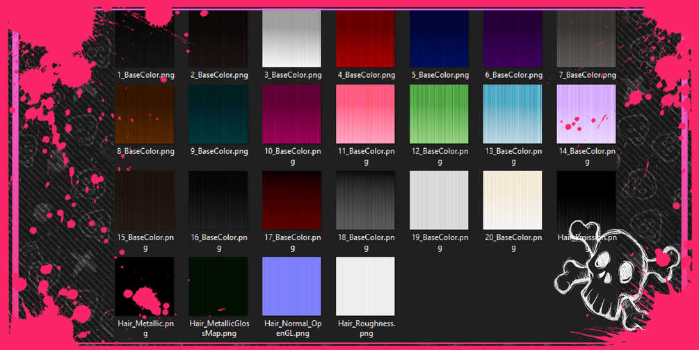 This pack includes 20 basecolor hair textures aswell as full PBR maps. ( Metallic, Metallic Gloss, Roughness and Normal.