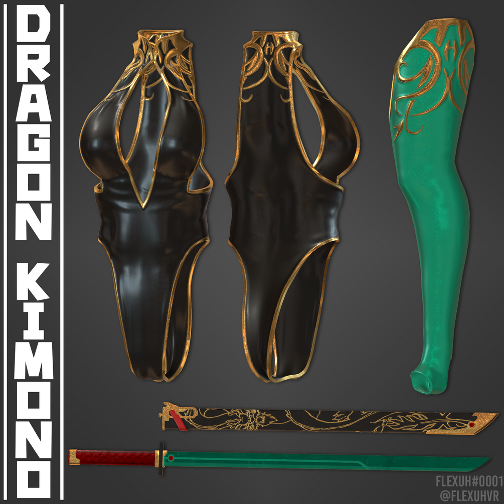 This set includes a full outfit set with kimono sleeves, bodysuit, skirt, body wrap, thigh highs & heels WITH a functional sword and sheath setup!
